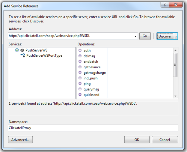 That will generate your C# proxy and give you a class called PushServerWSPortTypeClient. You’ll use this class for all your SMS needs.