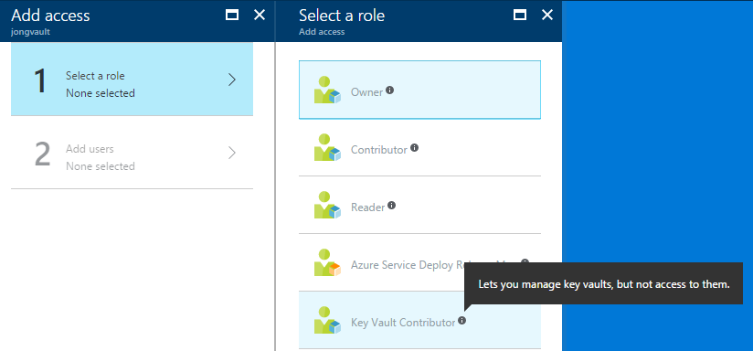 1. Go to the newly created vault and select “Access Control (IAM)” and then click the Add button.