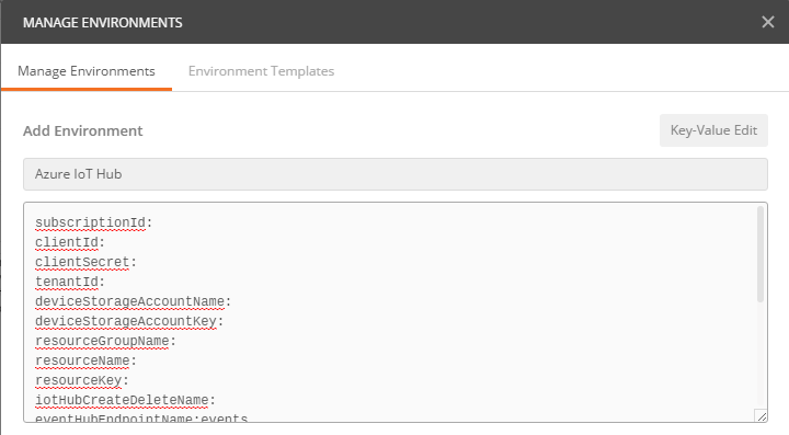 Postman allows you to setup variables and allows you to group them by “Environment”. For this exercise, you will create a new Environment and add the required variables.