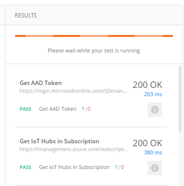 With the current configuration, the tests will take a while to execute because I am running the “Create IoT Hub” request and the “Verify IoT Hub” request, which is a polling request that returns a “Success” code when the IoT Hub is created.