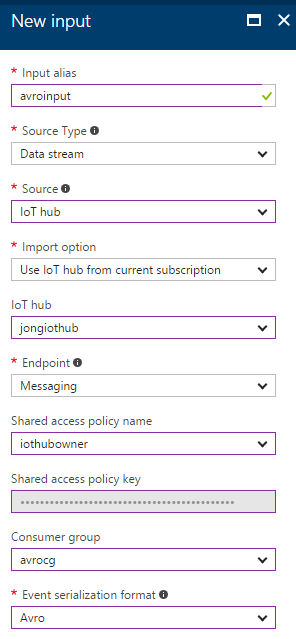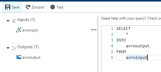 Something to be aware of, ASA does not allow you to test the input with a physical Avro container file, like it does with JSON/CSV. The only way to test Avro is to send the message to the ASA Input and view the logs if you have issues. The logs are not that helpful as all it says is the file is invalid.