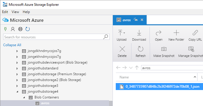 1. Open Azure Storage Explorer, sign-in and navigate to the Blob Storage account you created earlier. Expand the Blob Containers node. Click on ‘avros’ and you will see a JSON file in the right pane.
