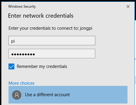 - Select ‘Use a different account’ and enter ‘pi’ and ‘raspberry’ (or whatever you set your Samba user/password to). Check ‘Remember my credentials’ so you don’t get prompted everytime you access the share.