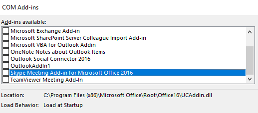 2. Uncheck “Skype Meeting Add-in for Microsoft Outlook 2016”