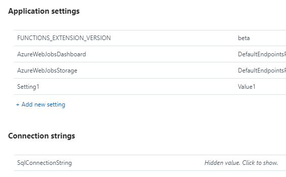 First, update your AppSettings and ConnectionString settings to includeSetting1andSqlConnectionString
