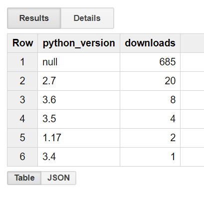 null = downloads from PyPI using clients that do not support sending the statistics we’re querying against. This can be an older version of pip or alternate clients. You also see 341 downloads from 1.17, which is…who knows! When making maintenance decisions you should factor these unknowns as you feel appropriate.