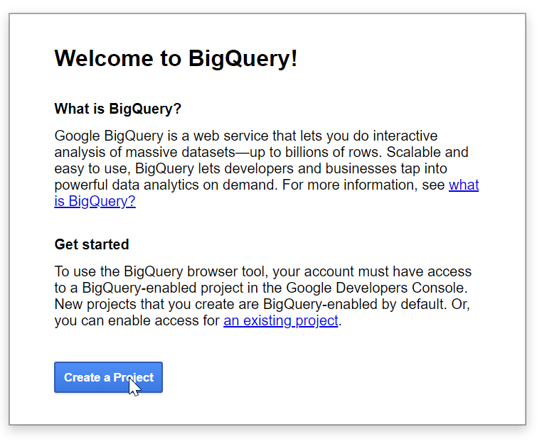 - You need to sign up for Google Cloud Platform, Create a Project, and Enable BigQuery API for that project to run BigQuery API queries.