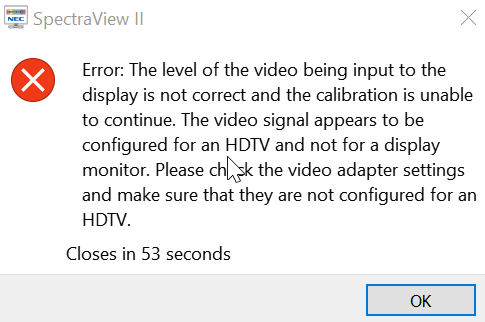 Error: The level of the video being input to the display is not correct and the calibration is unable to continue. The video signal appears to be configured for an HDTV and not for a display monitor. Please check the video adapter settings and make sure that they are not configured for an HDTV.