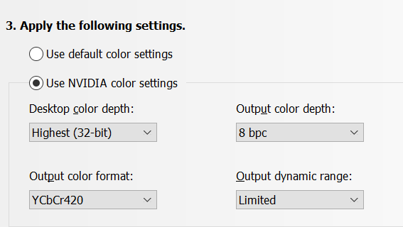 - Under, Apply the following settings. Select “Use NVIDIA color settings”. If “Output dynamic range:” allows you to select “Full”, then do so, otherwise leave as “Limited”.