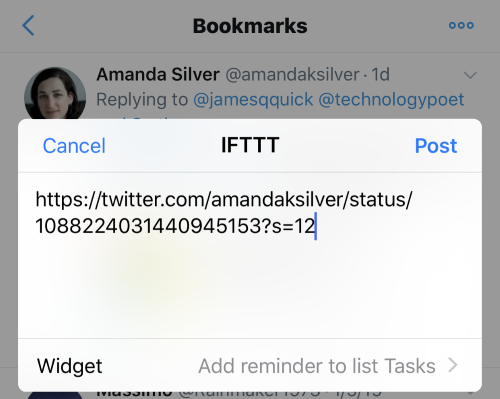 Now, head over to the Twitter app, Share Tweet via…IFTTT and then view them in your Microsoft To-Do Task list.