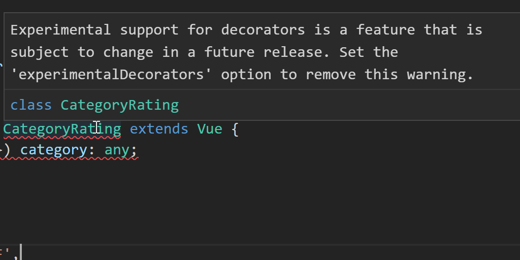 Experimental support for decorators is a feature that is subject to change in a future release. Set the ‘experimentalDecorators’ option to remove this warning.