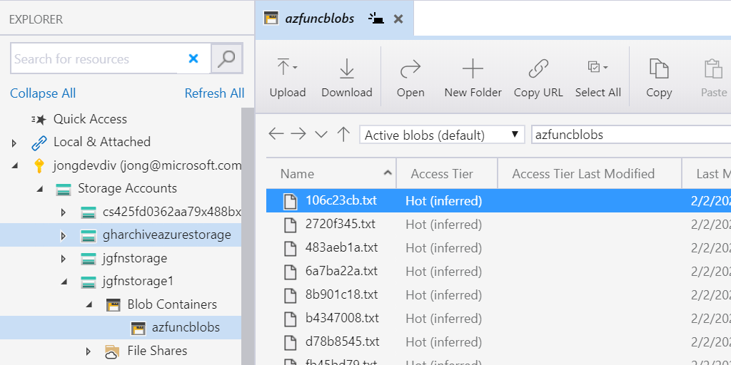 Open Storage Explorer and navigate to: Subscription -> Storage Accounts -> Storage Account -> Blob Containers -> azfuncblobs